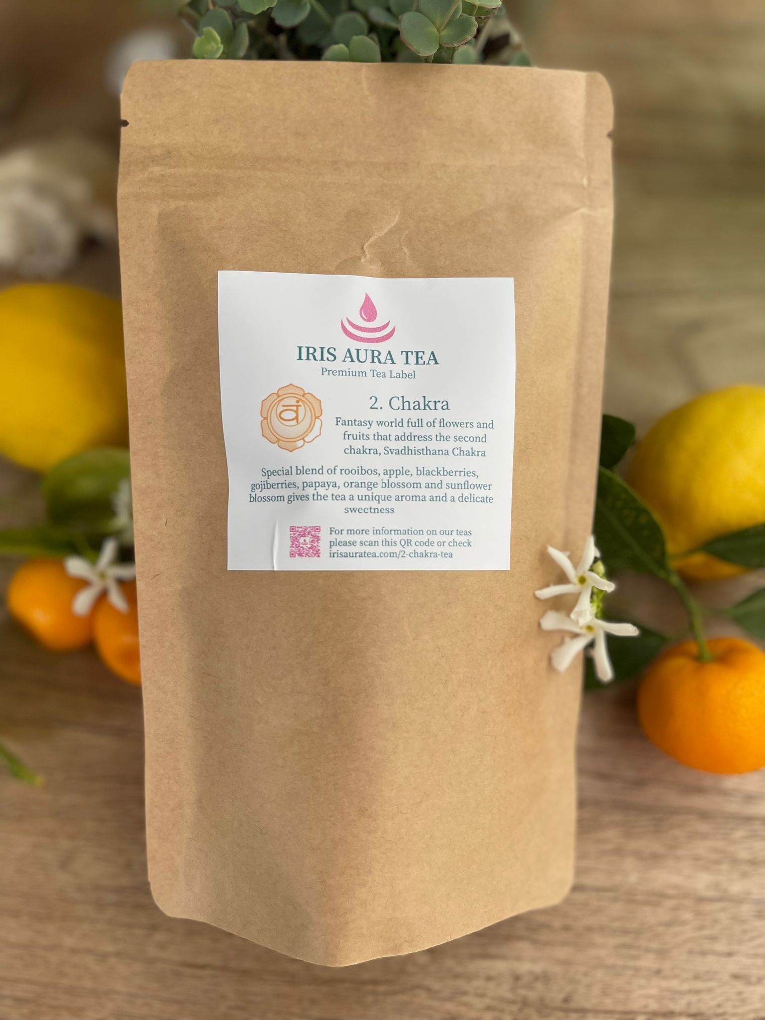 Tauchen Sie ein in eine zauberhafte Welt voller Blumen und Früchte mit unserem speziell auf das zweite Chakra, das Svadhisthana-Chakra, abgestimmten Tee. Unsere sorgfältig ausgewählte Mischung aus Rooibos, saftigen Äpfeln, süßen Brombeeren, nahrhaften Gojibeeren, exotischer Papaya sowie zarten Orangen- und Sonnenblumenblüten erzeugt eine einzigartige Aromatik und eine delikate Süße.