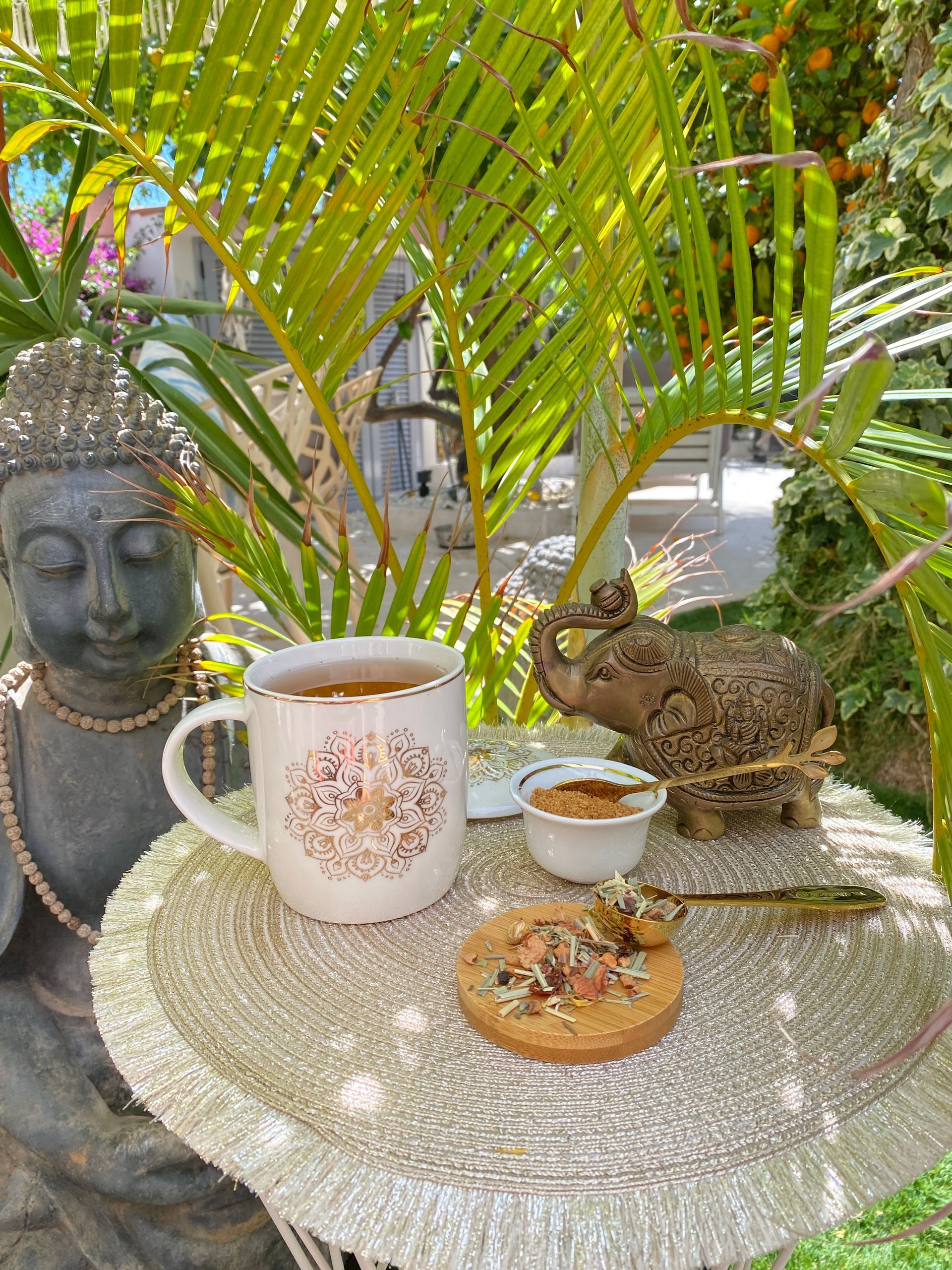 The Ayurveda herbal tea with rose petals, cardamom, licorice root, coriander, fennel, ginger and pieces of cinnamon is a carefully composed blend that is specially tailored to the third chakra, the Manipura chakra. This chakra represents strength, motivation and self-confidence. Each ingredient has been chosen for its unique properties to harmonize and balance the Manipura Chakra.